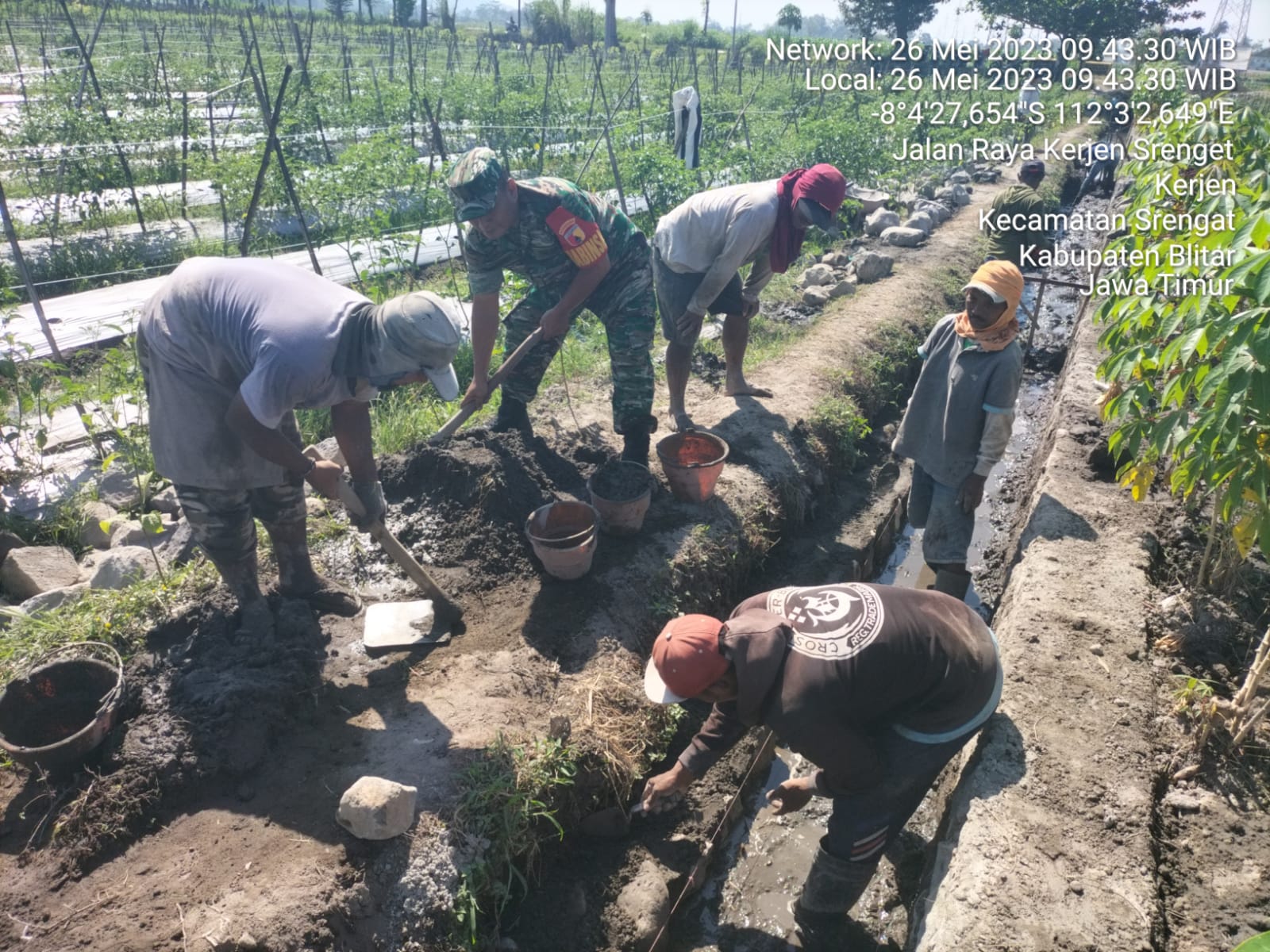 Blitar, Lintas5terkini.com – Sebagai wujud perhatian dan kepedulian terhadap pembangunan di wilayah, Babinsa Koramil 0808/06 Srengat Kodim 0808/Blitar Serda Musidi, melaksanakan kegiatan membantu warga masyarakat membangun saluran irigasi, bertempat di Lingkungan Bening Kel. Togogan Kec. Srengat Kab. Blitar, Jumat (26/5/2023).