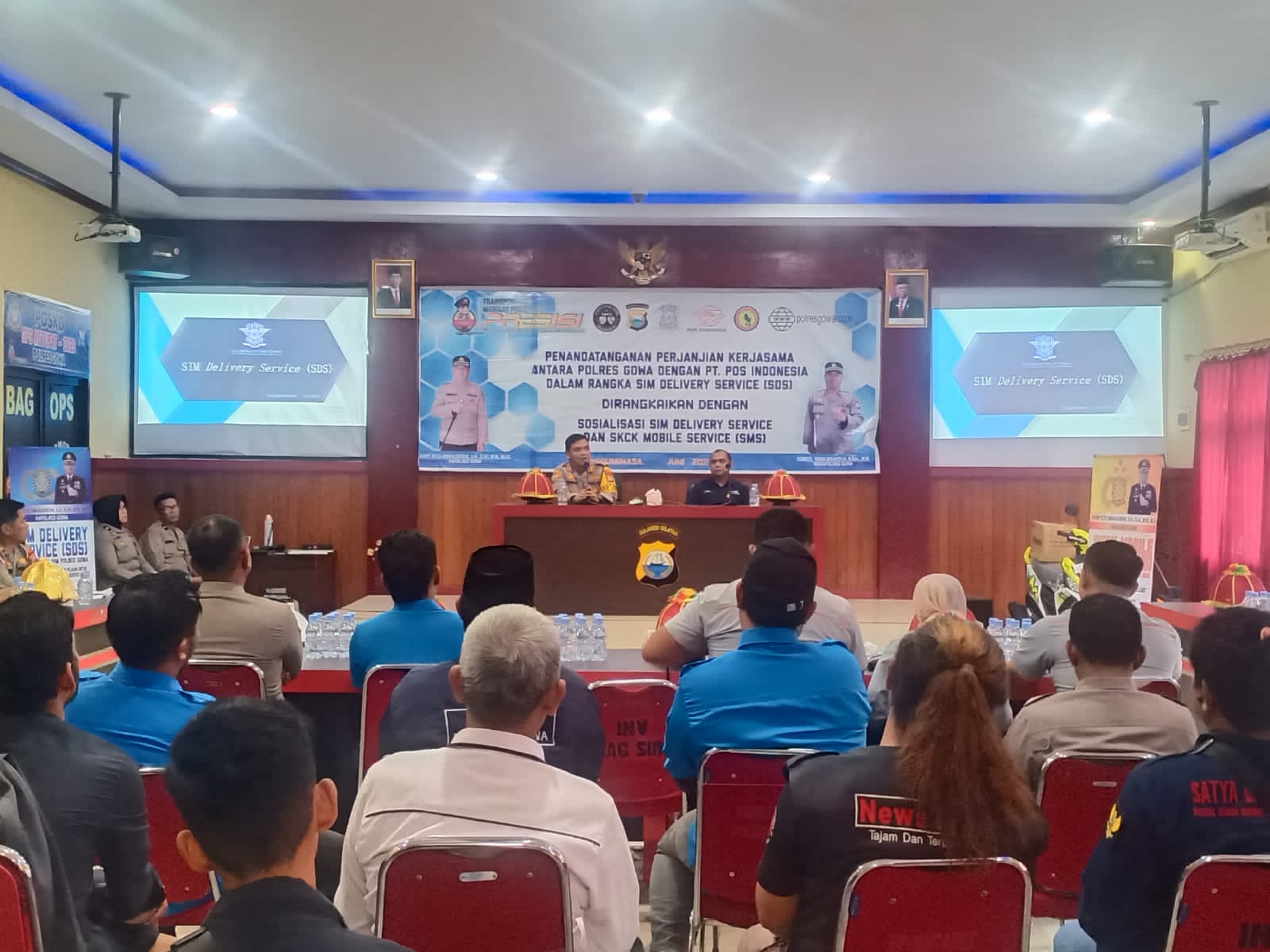 Gowa, Lintas5terkini.com – Kapolres Gowa, AKBP Reonald Simanjuntak, SH, SIK, MM, MIK melakukan penandatanganan perjanjian kerjasama dengan PT. Pos Indonesia sekaligus dirangkaikan sosialisasi Sim Delivery Service (SDS) dan SKCK Mobile Service (SMS), di Aula Endra Dharmalaksana Polres Gowa, Rabu (14/06/2023).