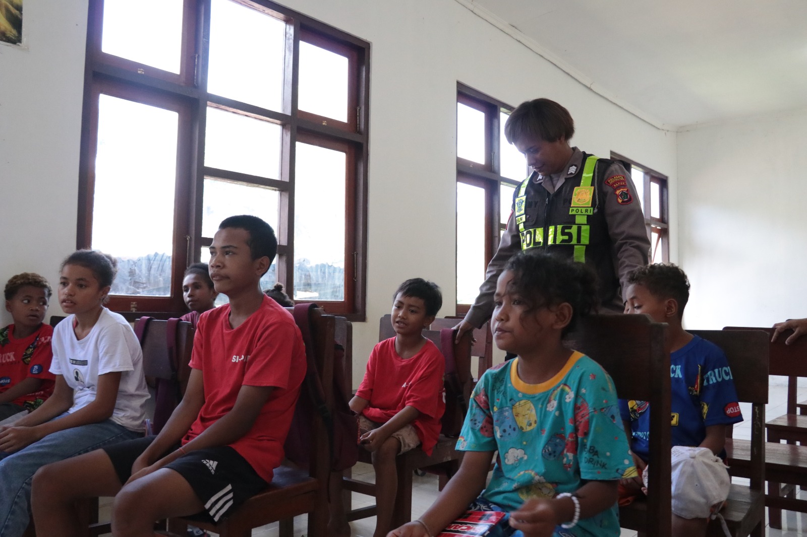 Lintas5terkini.com Polresta Jayapura Kota, | Ops Rasaka Cartenz 2023 Polresta Jayapura Kota masih berlanjut, kali ini Program Si-Ipar (Polisi Pi Ajar) bersama dua Sat Lantas Polresta Jayapura Kota mengajar para anak-anak di Asrama Balim Yalimo, Distrik Heram, Senin (24/07) siang.