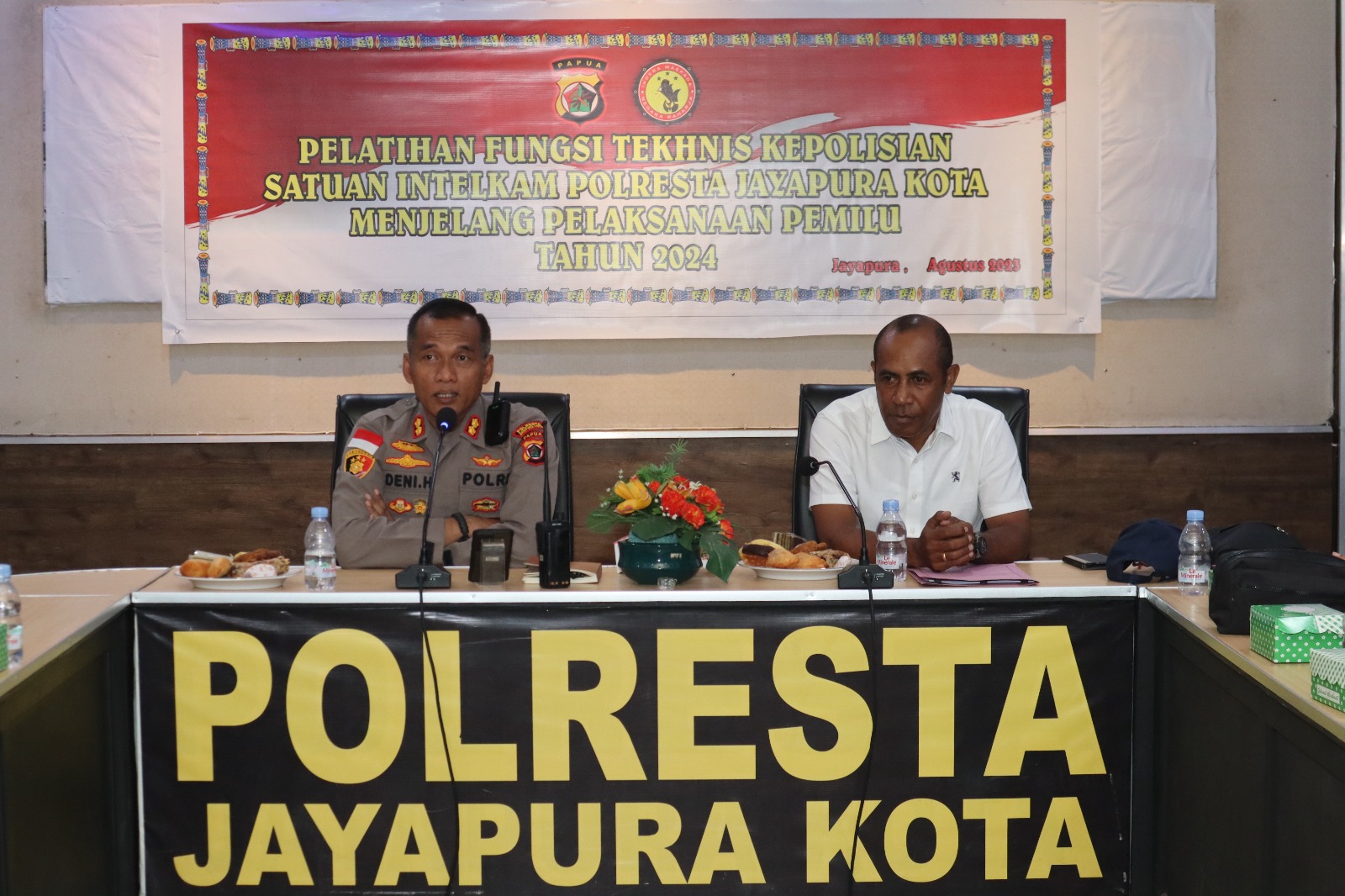 Lintas5terkini.com Polresta Jayapura Kota, | Bertempat di Aula Mapolresta Wakapolresta Jayapura Kota AKBP Deni Herdiana, S.E., S.H., M.M., M.H membuka kegiatan Pelatihan Fungsi Kepolisian Satuan Intelkam menjelang pelaksanaan pemilu tahun 2024, Rabu (9/8) pagi.