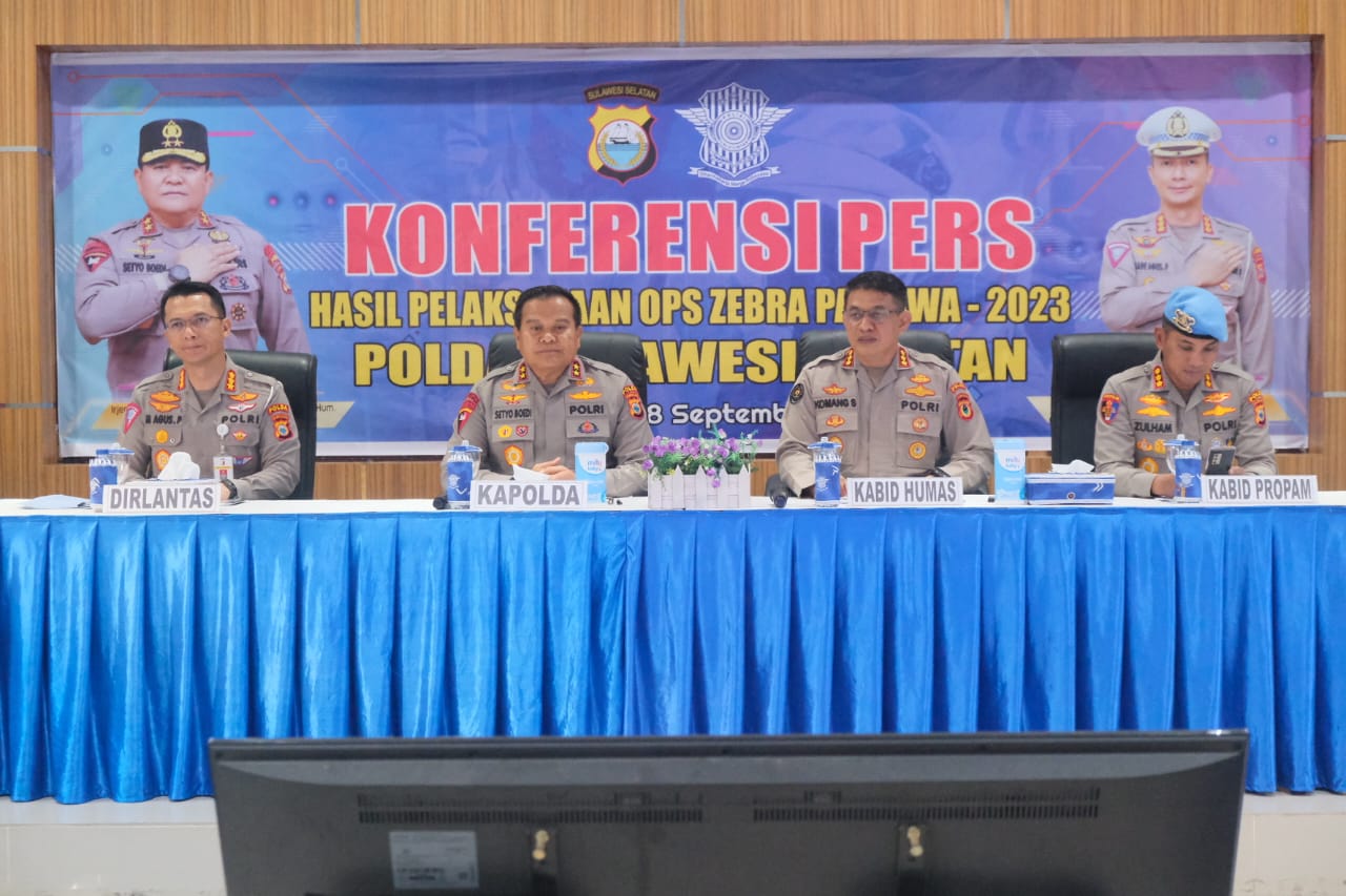 Makassar, Lintas5terkini.com – Kapolda Sulsel Irjen Pol Drs. Setyo Boedi Moempoeni Harso, S.H., M.Hum menggelar Press Release Analisa dan Evaluasi (Anev) kegiatan Operasi Zebra Pallawa 2023 di Mako Ditlantas Polda Sulsel, Senin (18/9/2023).