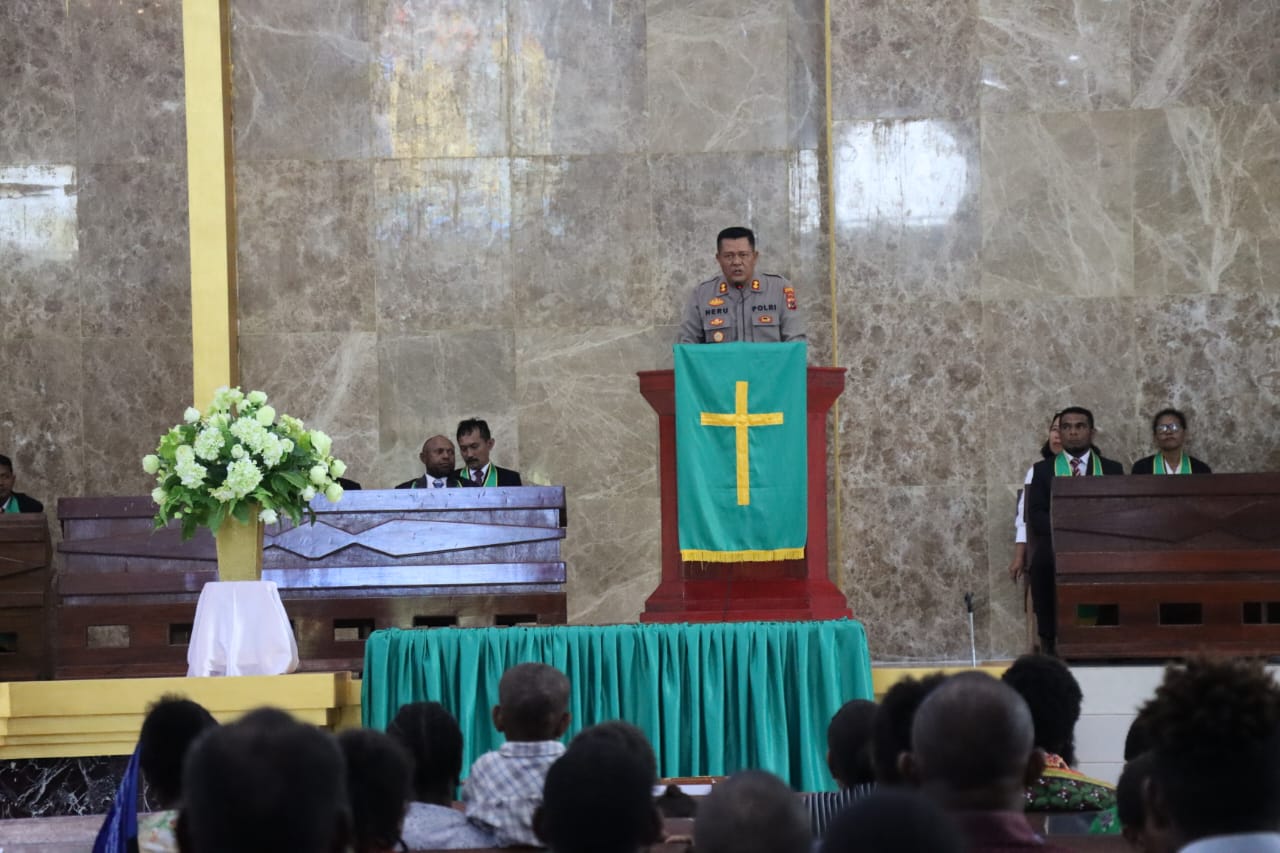 Kapolres Yahukimo dalam kesempatannya mengucapkan terima kasih kepada Bapak Pendeta dan anggota jemaat semuanya atas waktu yang diberikan kepada kami, tujuan kami hadir disini yaitu untuk memperkenalkan diri sebagai pejabat baru Kapolres Yahukimo yang mana kiranya dapat menerima kami dan mohon doa dari Bapak ibu agar dalam pelaksanaan tugas selalu diberikan perlindungan.
