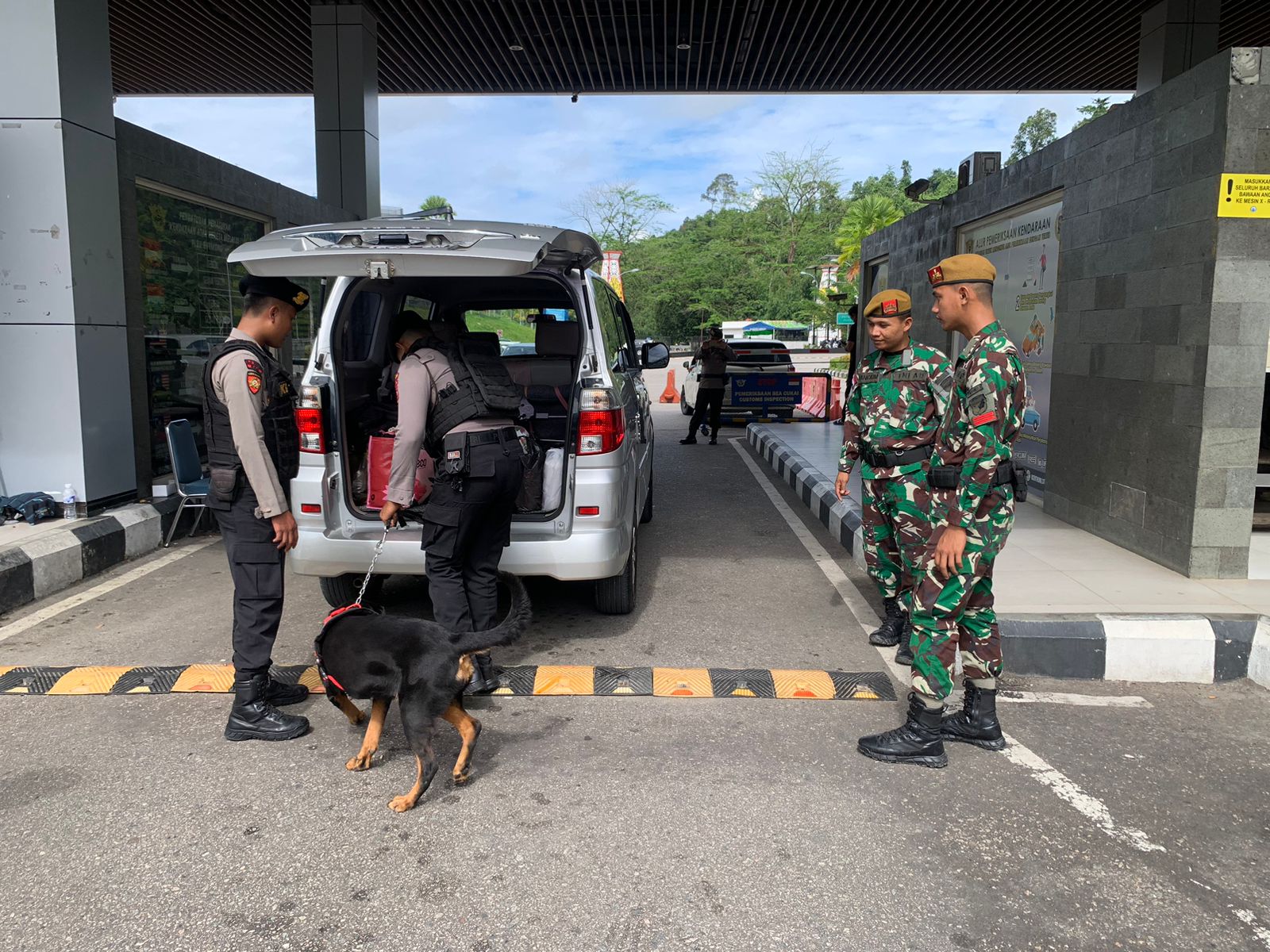 Satgas Pamtas RI-Malaysia Yonarmed 16/TK Pos Kotis Gabma Entikong yang dipimpin oleh Serda Hendri beserta 4 orang anggota lainnya dan Tim K-9 Brimob Polda Kalimantan Barat bekerja sama mengawasi alur masuk keluar barang dan jasa PLBN Entikong di Desa Entikong, Kecamatan Entikong, Kabupaten Sanggau, Prov. Kalimantan Barat. Selasa (28/5/2024).