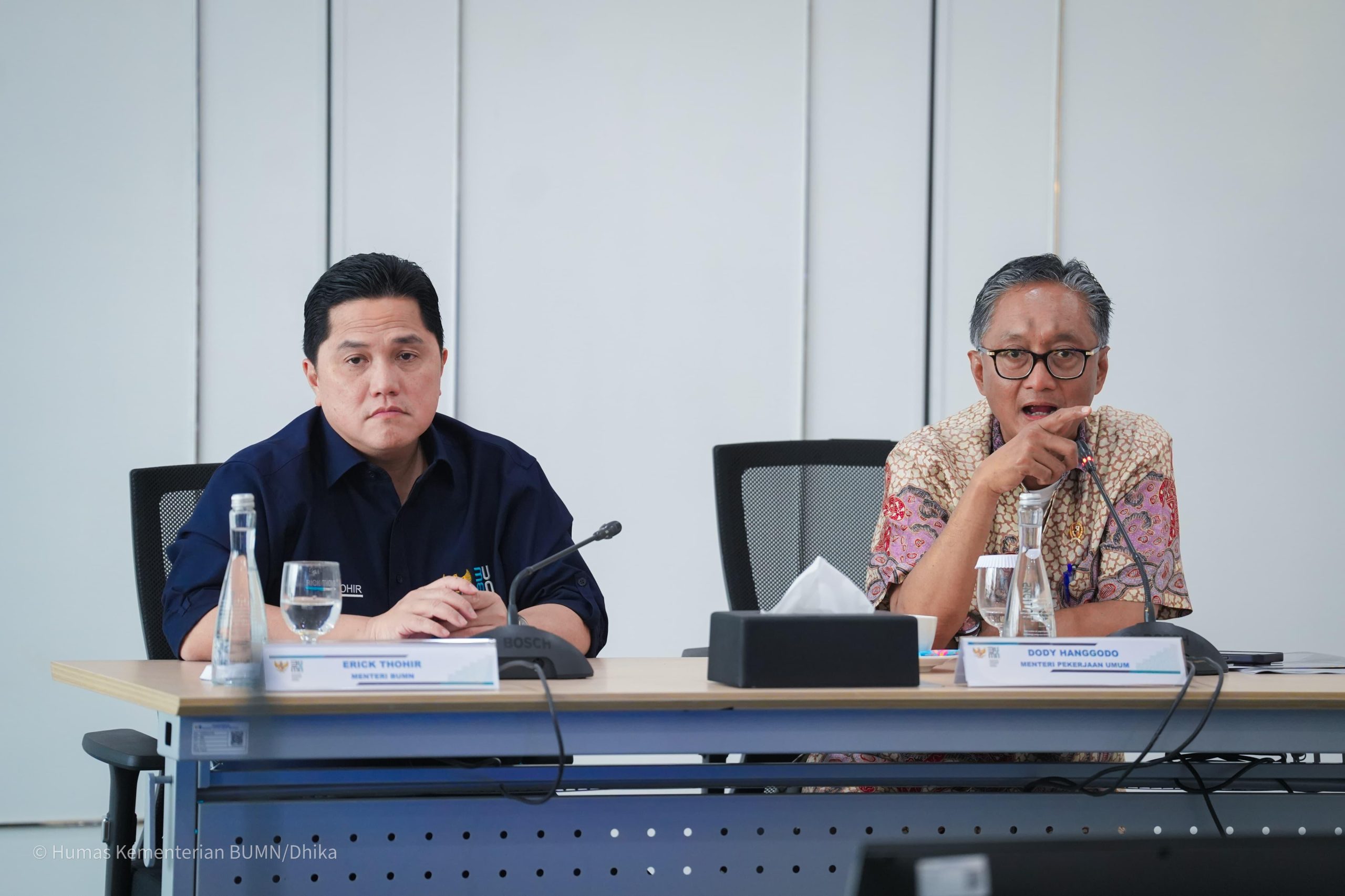 “Kita sudah konsolidasi, terima kasih Pak Menteri PU yang sudah memetakan isu-isu karena memang kami harus memastikan program besar Bapak Presiden Pak Prabowo mengenai swasembada hilirisasi ini, kita bisa mendukung dari sisi infrastrukturnya,” ujar Erick saat konferensi pers dengan Menteri Pekerjaan Umum Dody Hanggodo di lobi utara kantor Kementerian BUMN, Jumat (15/11).