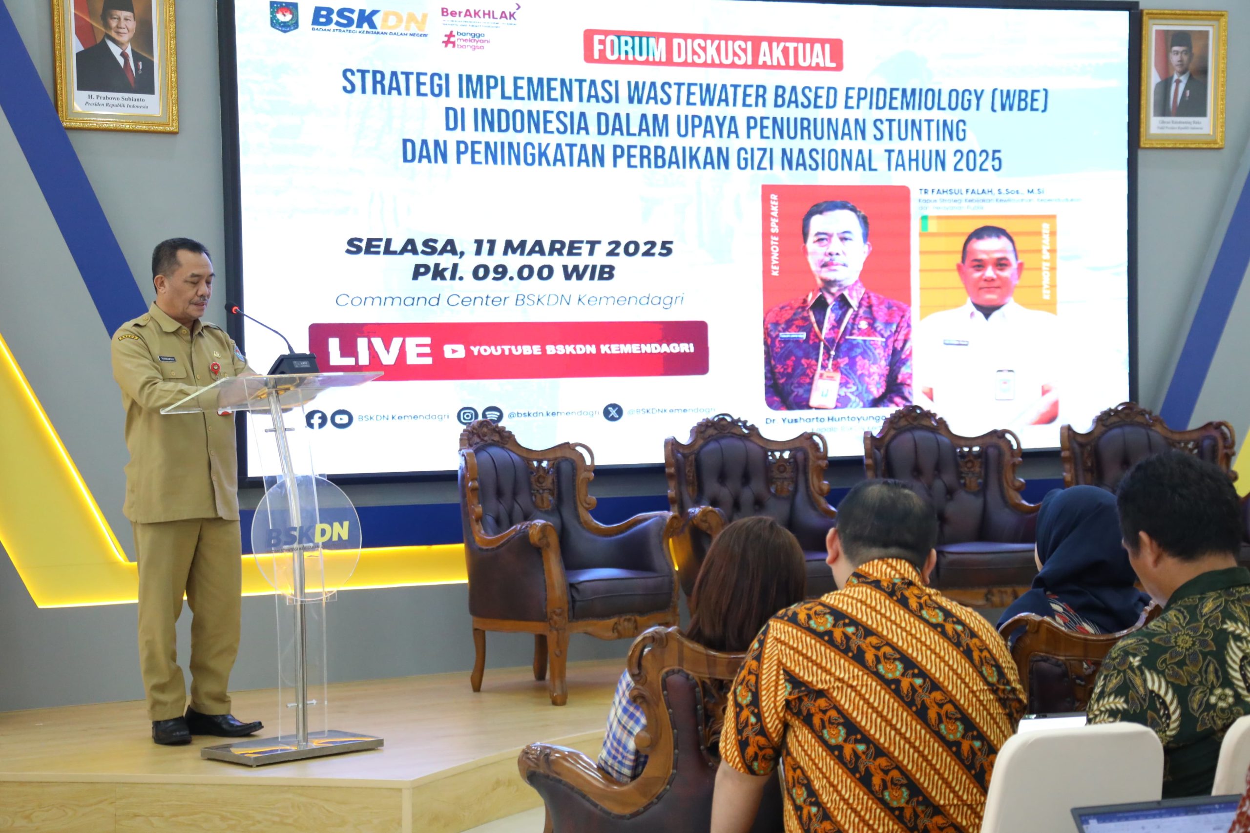 “Survei Status Gizi Indonesia menunjukan angka stunting di Indonesia sebesar 21,5 persen pada tahun 2023. Salah satu penyebab utamanya adalah sanitasi buruk dan tingginya paparan patogen yang berdampak pada kesehatan anak. Untuk itu, butuh intervensi berbasis bukti yang lebih komprehensif,” ujar Kepala BSKDN Kemendagri Yusharto Huntoyungo saat membuka Forum Diskusi Aktual (FDA) bertajuk “Strategi Implementasi WBE dalam Upaya Penurunan Stunting dan Perbaikan Gizi di Indonesia” di Ruang Command Center BSKDN, Jakarta, Selasa (11/3/2025).