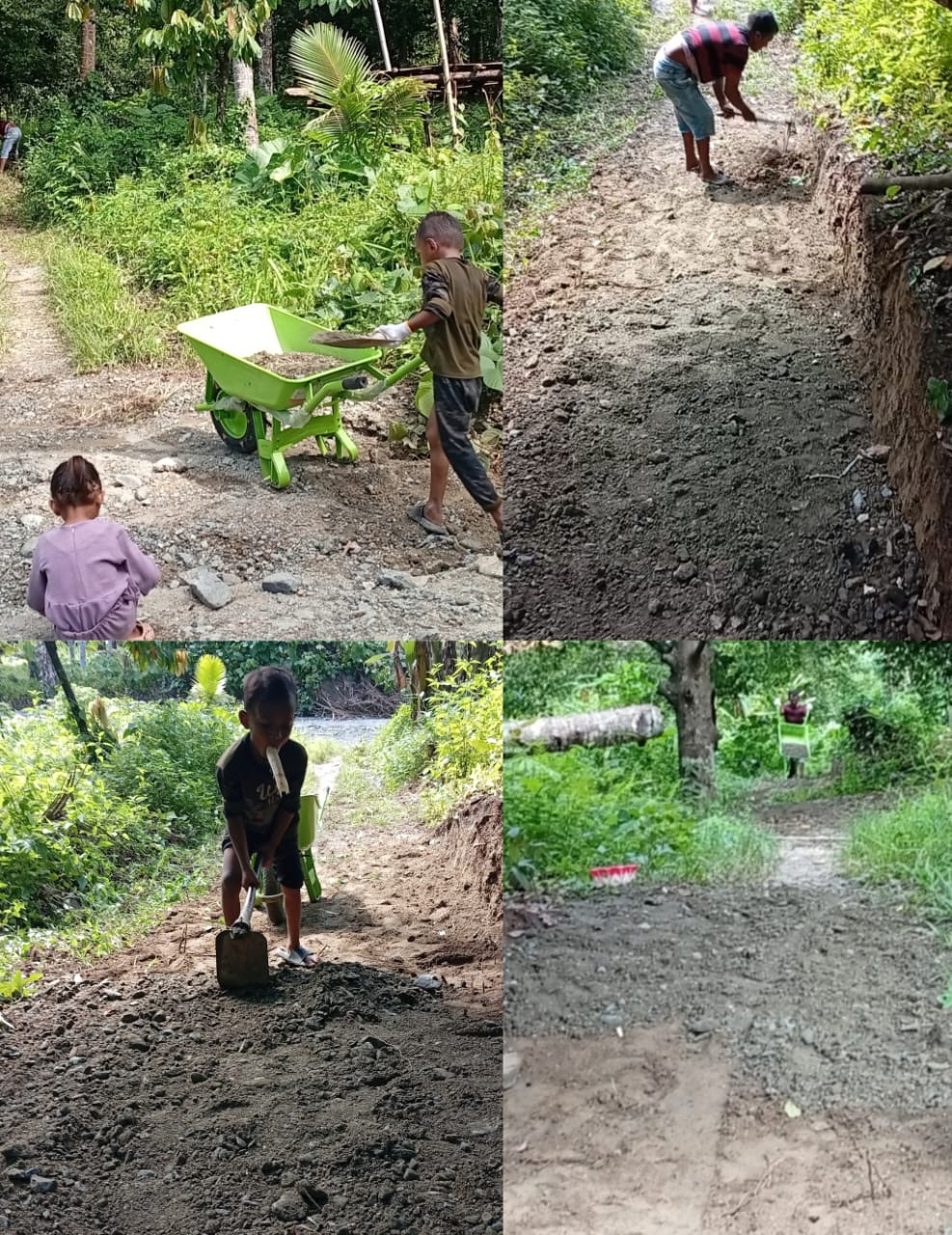 Warga 20 KK Kesulitan Akses Jalan, Anak SDN 168 Halsel Bantu Ayah Seorang Wartawan Bangun Jalan