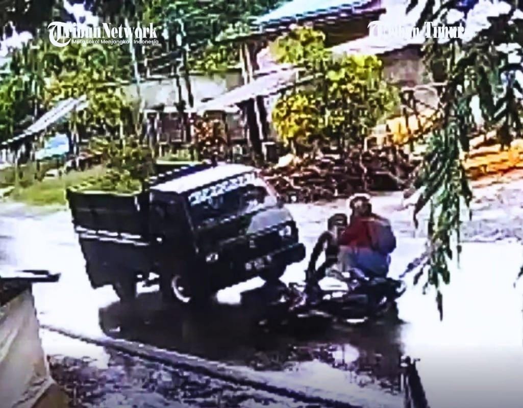 Dari arah berlawanan, mobil pickup dengan nomor polisi DD 8404 AL tampak bergerak tidak stabil. Beberapa detik kemudian, kendaraan tersebut tiba-tiba keluar jalur ke arah kanan, tepat ke arah laju sepeda motor tersebut.