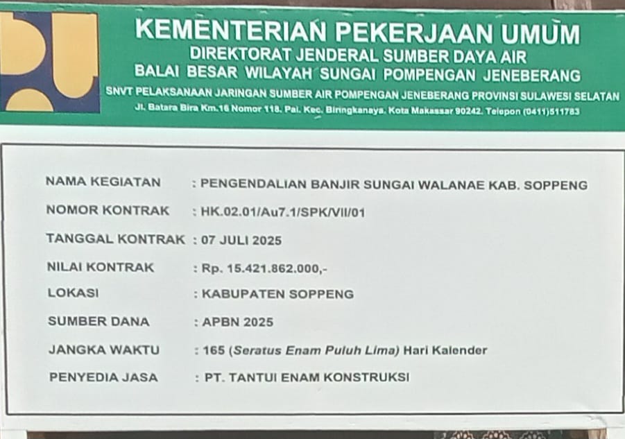 Soppeng, Lintas5terkini.com — Proyek Pengendalian Banjir Sungai Welanae di Kabupaten Soppeng mendapat sorotan tajam dari warga setempat. Proyek ini dilaksanakan berdasarkan Kontrak Nomor: HK.02.01/Au7.1/SPK/VII/01 tanggal 7 Juli 2025, dengan nilai kontrak sebesar Rp15.421.862.000 yang bersumber dari APBN Tahun Anggaran 2025.